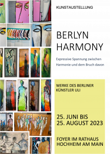 Vom 25.06. bis 25.08.23 gab es im Hochheimer Rathaus eine umfangreiche Ausstellung von Ulis Werken. Im Foyer finden klein- und großformatige Werke ihre Plätze, gleich ob abstrakte Farbspielereien oder figürlich anmutende Personengruppen. Die gesamte Klaviatur von Ulis bisherigen Werken sind in Hochheim zu sehen.
